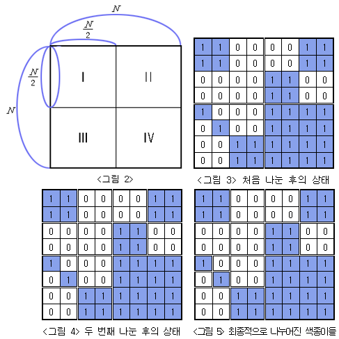 전체 종이가 모두 같은 색으로 칠해져 있지 않으면 가로와 세로로 중간 부분을 잘라서 <그림 2>의 I, II, III, IV와 같이 똑같은 크기의 네 개의 N/2 × N/2색종이로 나눈다. 나누어진 종이 I, II, III, IV 각각에 대해서도 앞에서와 마찬가지로 모두 같은 색으로 칠해져 있지 않으면 같은 방법으로 똑같은 크기의 네 개의 색종이로 나눈다. 이와 같은 과정을 잘라진 종이가 모두 하얀색 또는 모두 파란색으로 칠해져 있거나, 하나의 정사각형 칸이 되어 더 이상 자를 수 없을 때까지 반복한다.