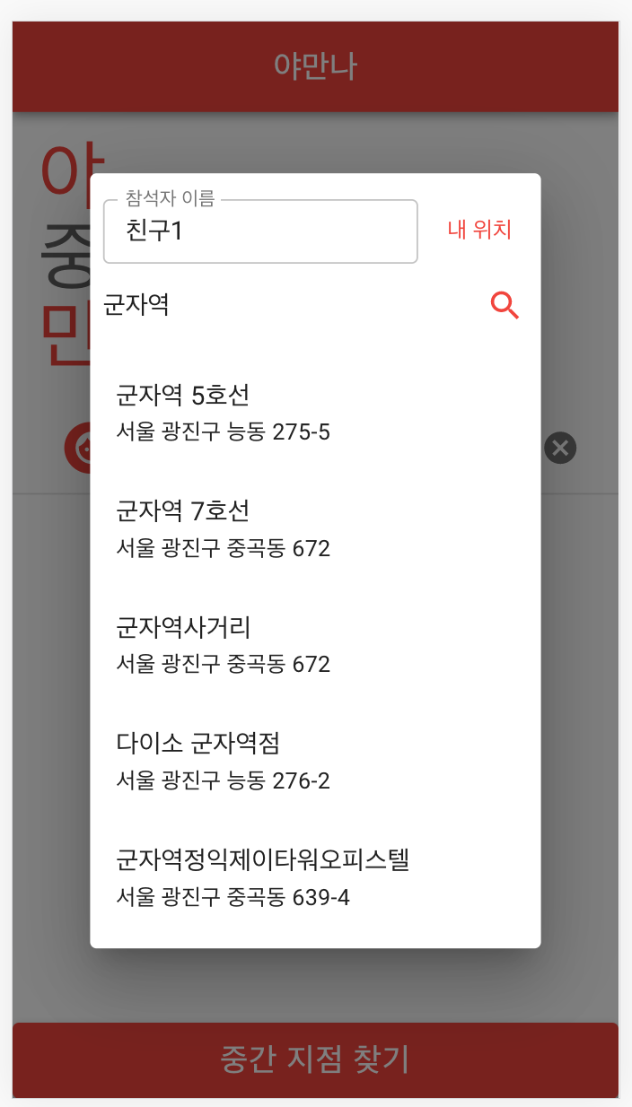 야만나는 친구들끼리 약속 장소를 정할 때, 중간 위치 인근에 있는 역이나 편의시설 등을 추천해주는 서비스입니다.